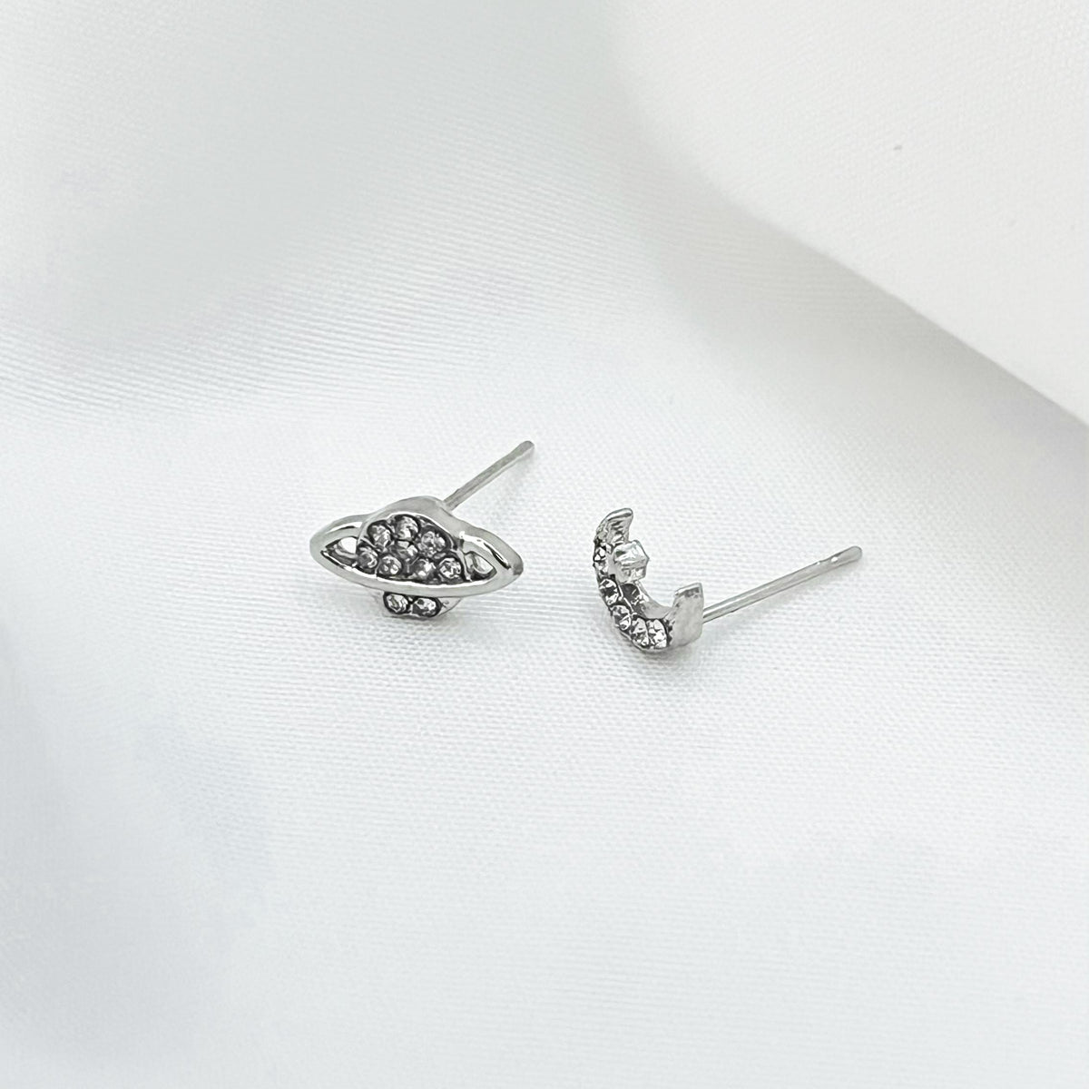 Silver Moon and Star Stud Earrings Mismatched Asymmetric Celestial Earrings Starburst Earrings Mismatched Planet Saturn CZ Stud Earrings